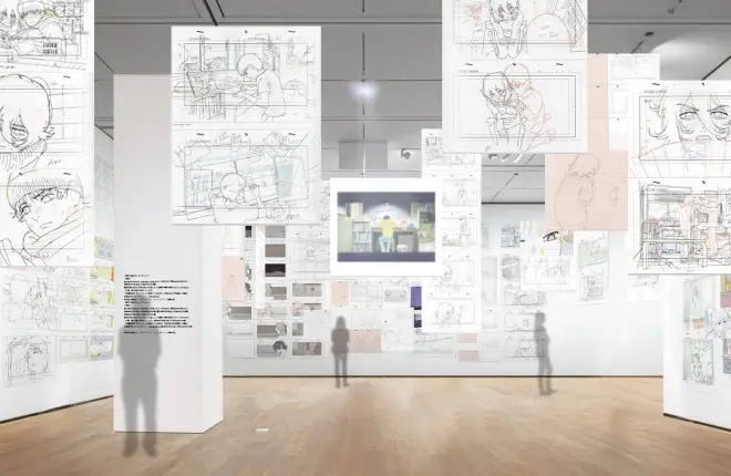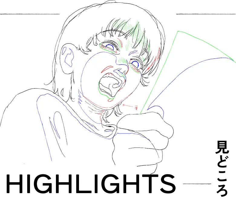 押山をはじめとするアニメーターが、劇場アニメ『ルックバック』にかけた熱量を感じることが出来る原画の数々を初展示します。原画を様々な場所から吊るして埋め尽くす“作画トンネル”が来場者を圧倒的な迫力で迎えます。劇場アニメ完成に至るまでのメモや設定画、原画など、制作過程において生まれる成果物を展覧会会場ならではのスケールで体験することができます。