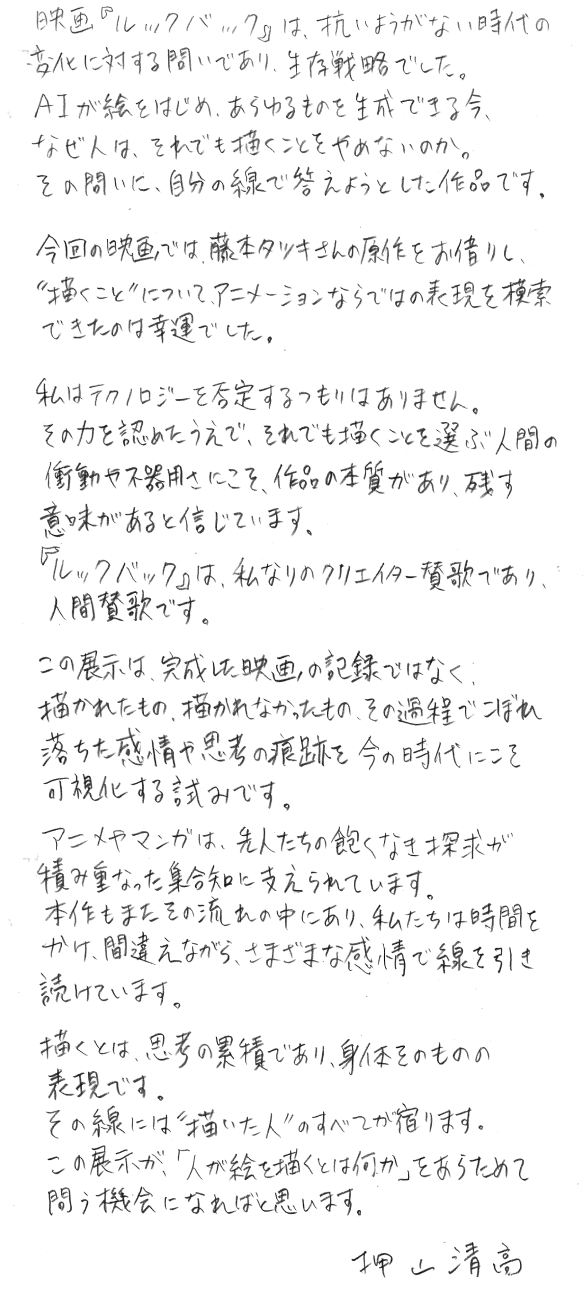 年には、監督・脚本・キャラクターデザイン・作画監督・原画を務めた劇場アニメ『ルックバック』を発表した。著書に『作画大全作画添削教室・押山式作画術増補合本