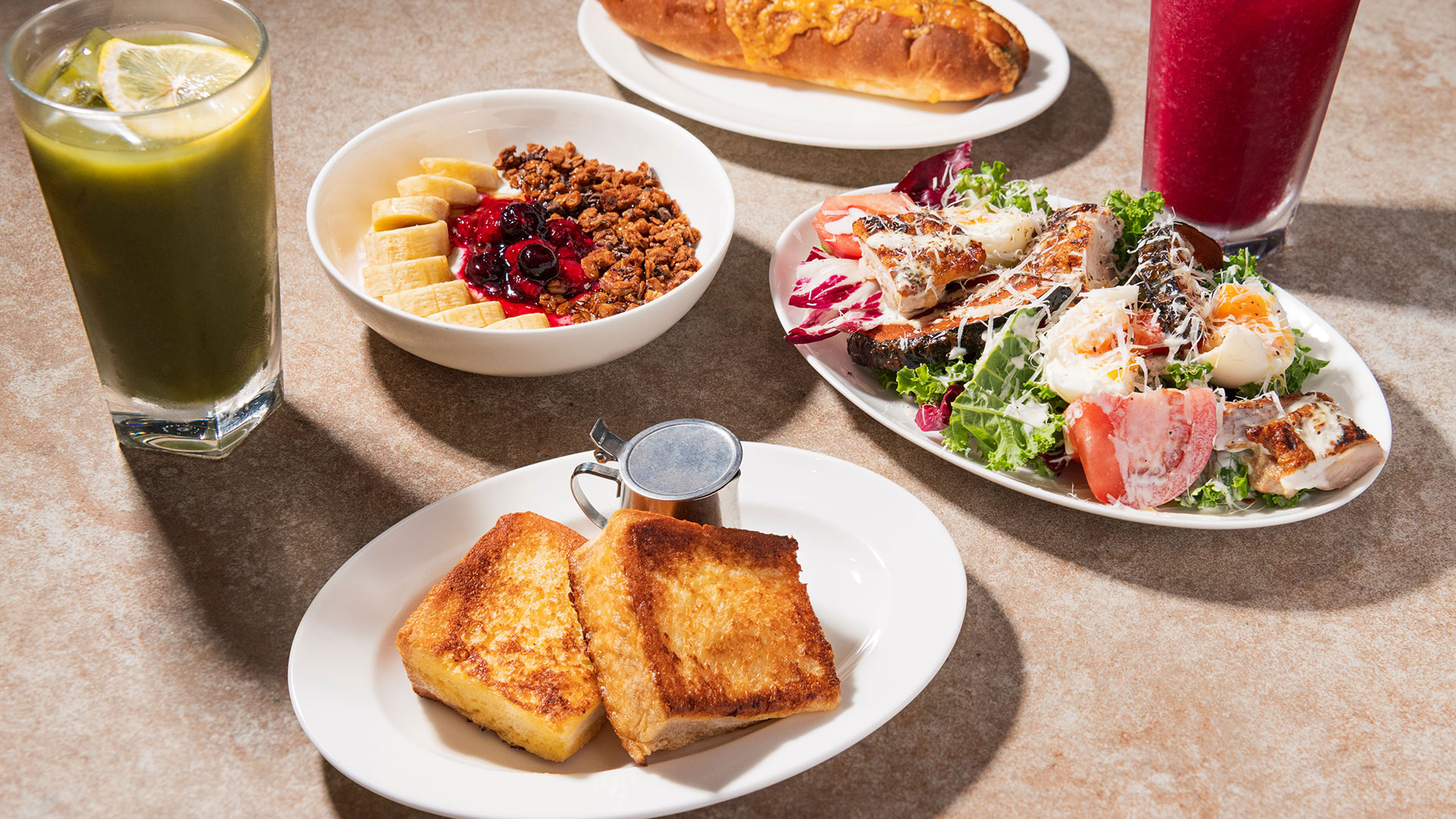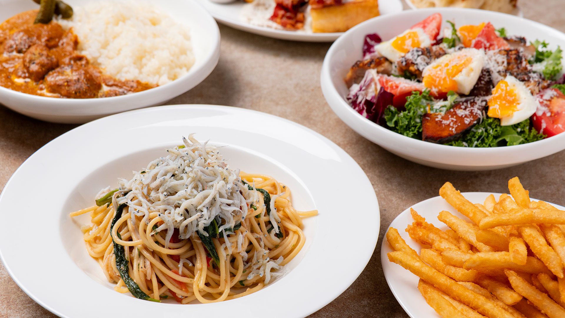 街のコンセプトである「GREEN&WELLNESS」をテーマに、健康志向のサラダやグルメホットドッグ、カレー、パスタなど、多彩なメニューをモーニングからディナーまでお楽しみいただけます。