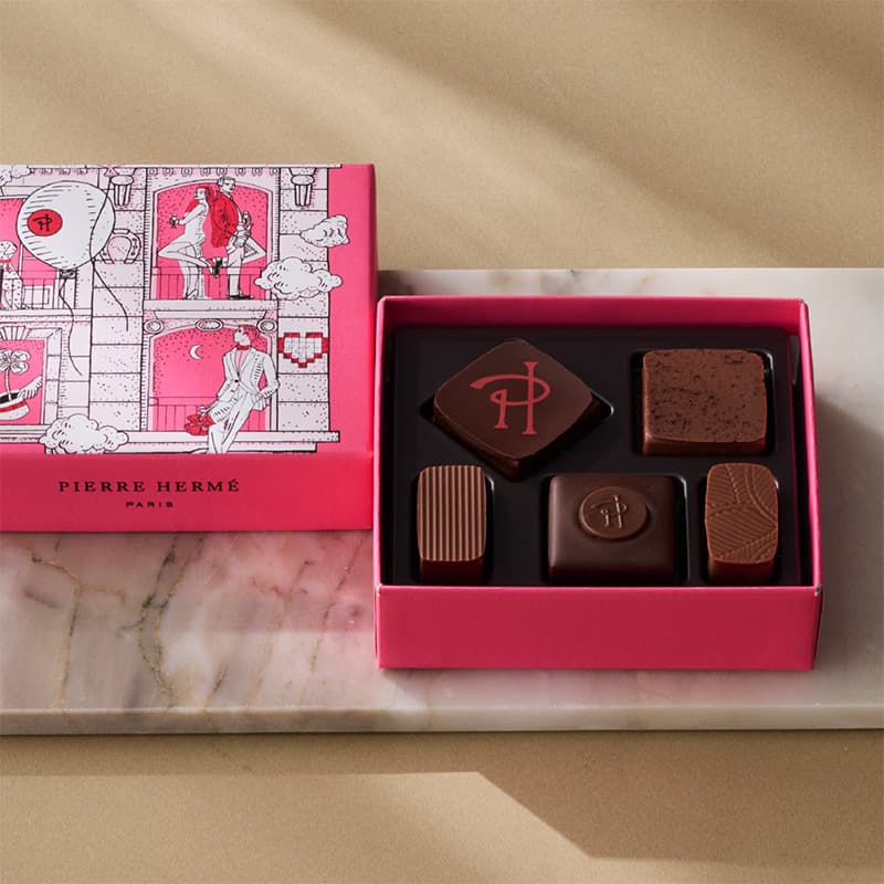 2026年バレンタインデーのために作られた特別なギフトボックス。限定ブシェ、「エピセ ヴァニーユ ポワーヴル」を含む、シェフ・パティシエ・ショコラティエのニコラ・クロワゾー氏による限定レシピのショコラと定番ショコラの詰め合わせです。パリ本店のファサードを繊細なタッチで描いた、限定ギフトボックスに入れてお届けします。