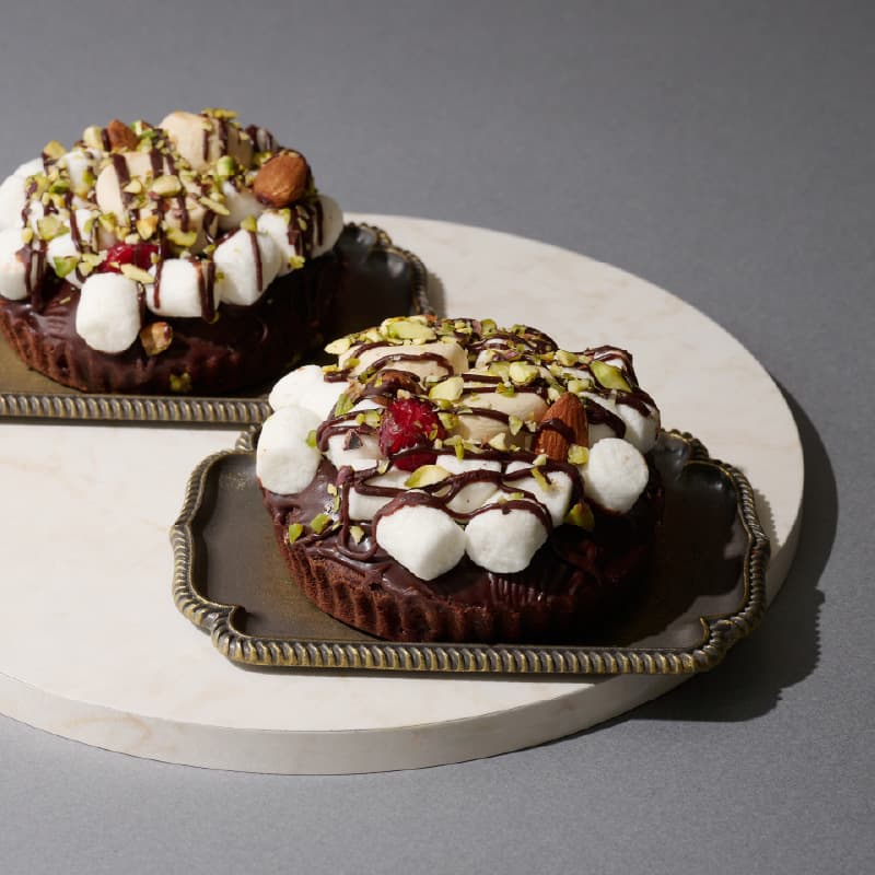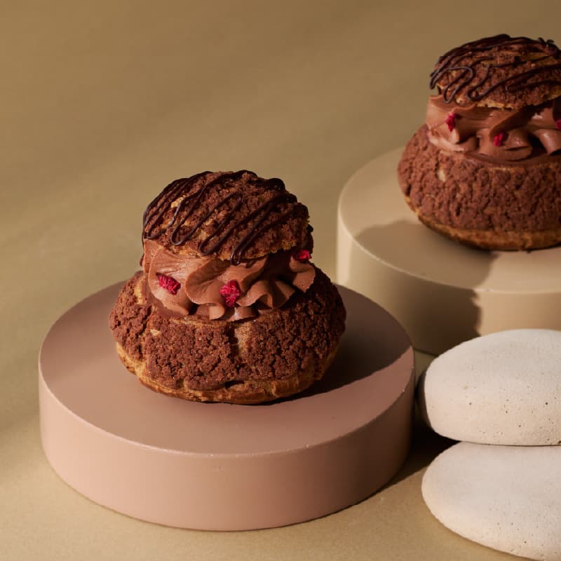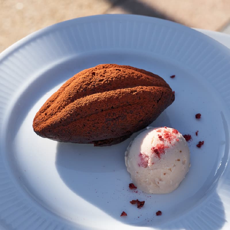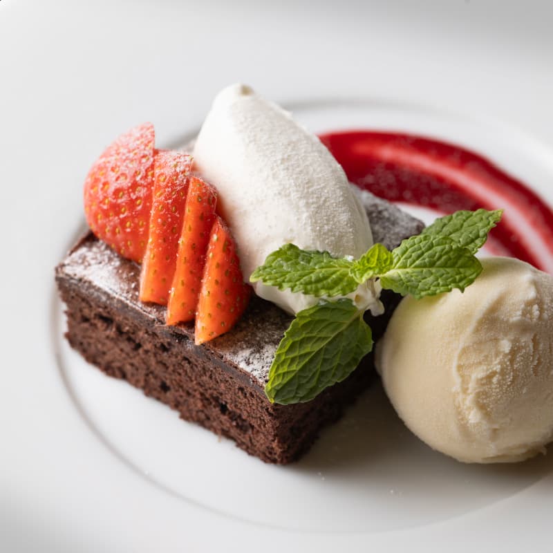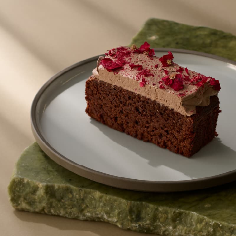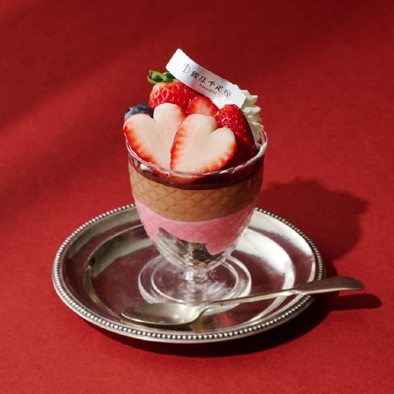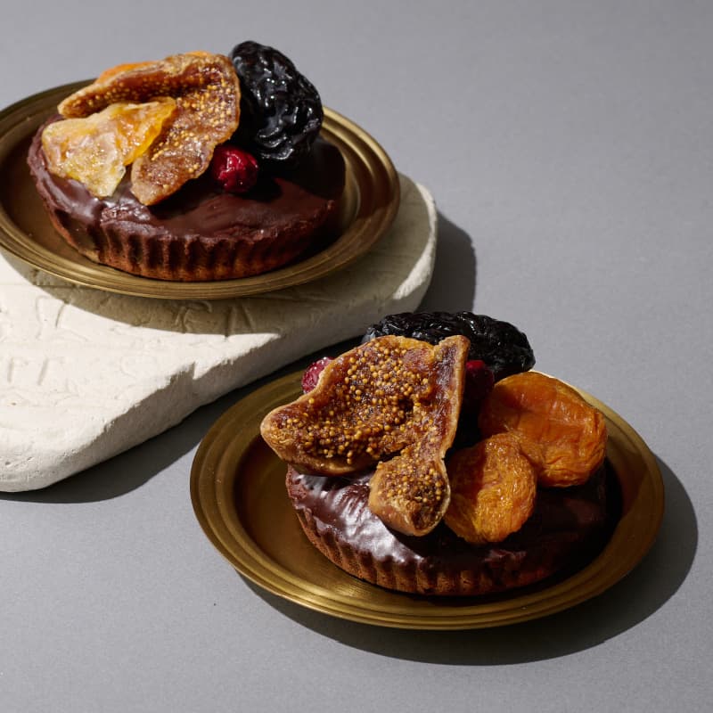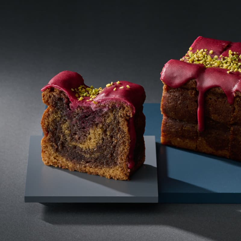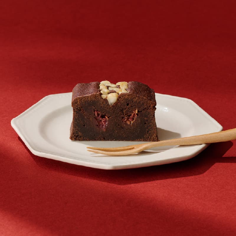 チョコレートとバランスの良い甘麹で甘味をつけたショコラテリーヌは、口の中で麹の香りがふんわりと広がる和テイスト。ラズベリーとイチゴをトッピングして、仕上げにはラズベリーとフランボワーズのパウダーを。人気の和紅茶とのマリアージュもおすすめです。