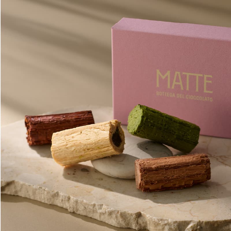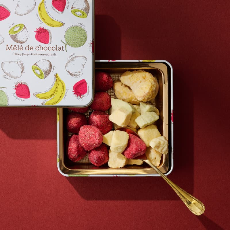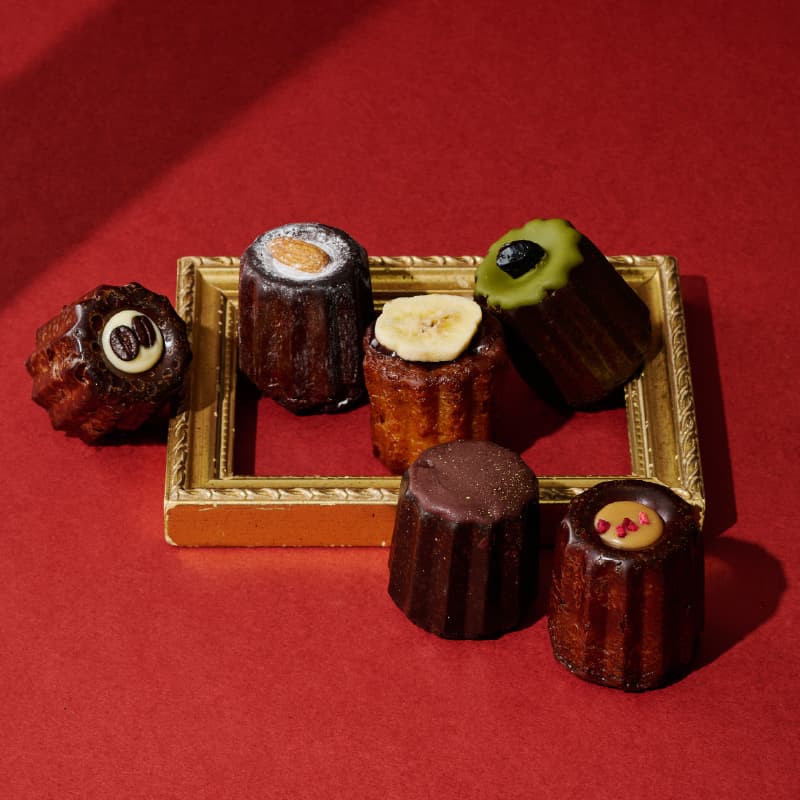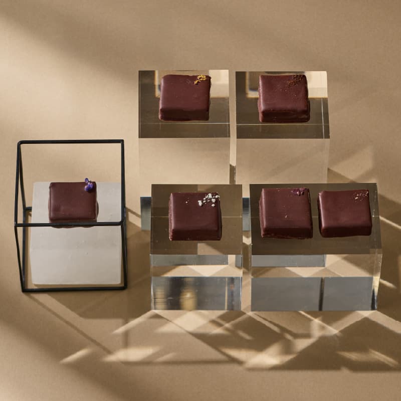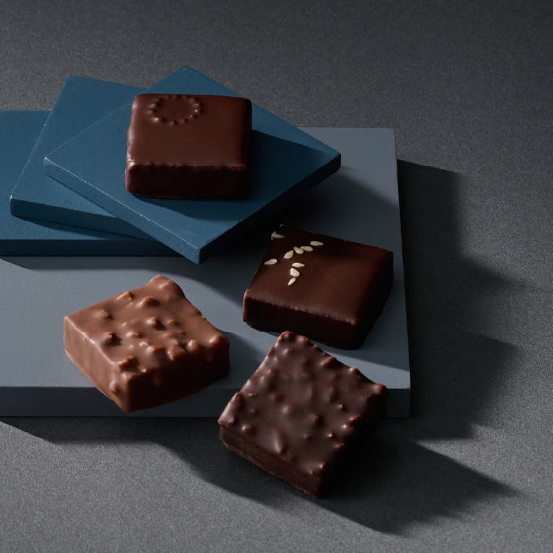バニラの風味が華やかに香るローズ、カシスをメインに数種のフルーツをブレンドしたヴィオレット、成田シェフ発案による金木犀の3種の「フルール」と、フレーズ・ミルク・カフェの3種の「レ」のショコラを宝石箱のようなボックスにアソート。一つ一つの味と香りの違いを堪能しながら、じっくりと味わいたい、ショコラ好きのためのショコラです。