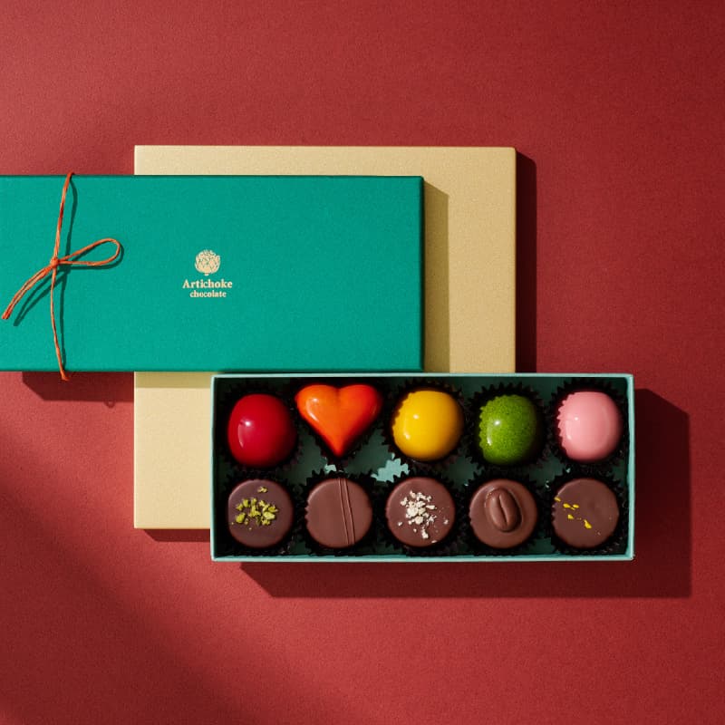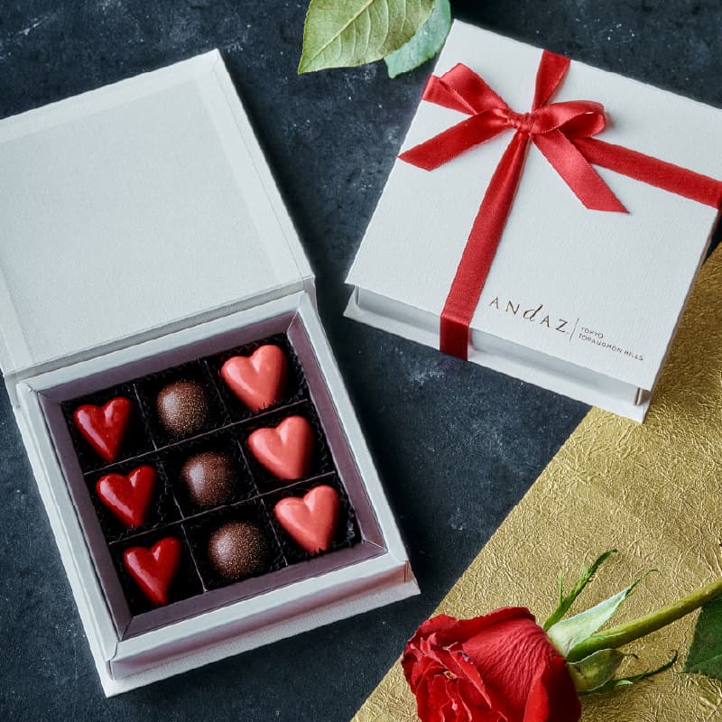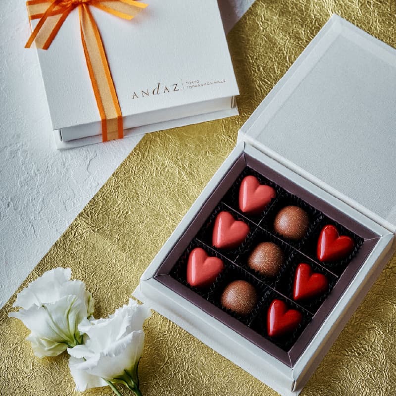 アソートの中心にはバレンタイン限定で作られる、通常のボンボンショコラの3〜4倍サイズの大きなハート型のショコラ「ブシェ」を。周りを囲むのはメゾンを代表する定番人気のレシピのショコラたち。これらをシンプルで高級感のある真っ赤なハート型のギフトボックスにアソートした、バレンタイン限定商品。