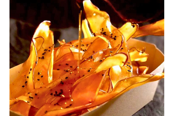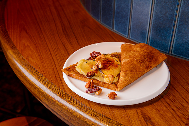 紅はるかとカスタードを混ぜ、ブリュレバターの塩味とキャラメルナッツの食感が楽しいクレープをご用意しました。