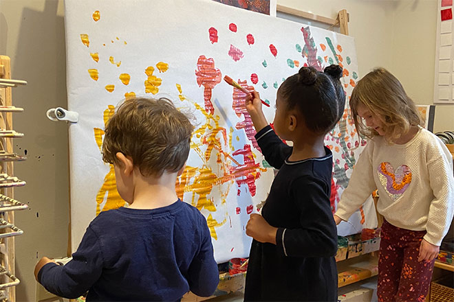 澄んだ空気とやわらかな日差しが心地よい小春日和。公園のなかには、季節の気配―小さな「小雪」を感じることができます。「今ここには、どんな風が吹いているだろう?」感じた風のかたちや色をキャンバスに描きます。集まった子どもたちの感覚が重なり、つながり、その日だけの公園の風景として立ちあがります。