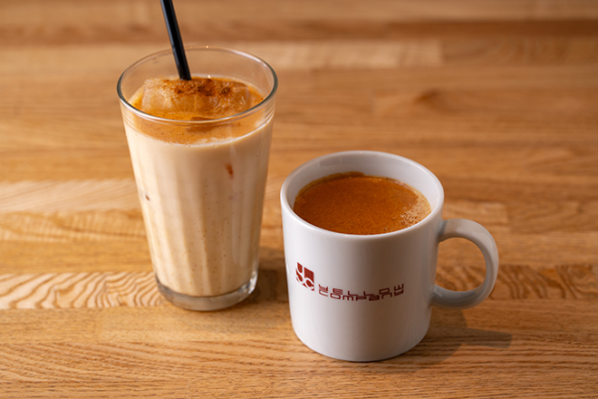 スパイス香るチャイに、さらりとチャイパウダーを振りかけて仕上げました。線の感情という展覧会の副題のように、温度によって表情を変える香りと余韻をお楽しみください。