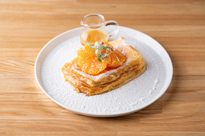 ペリカンカフェの人気メニューフレンチトーストを作中の雪景色と象徴的なオレンジをモチーフに仕上げました。お好みでオレンジのソースをかけてお召し上がりください。