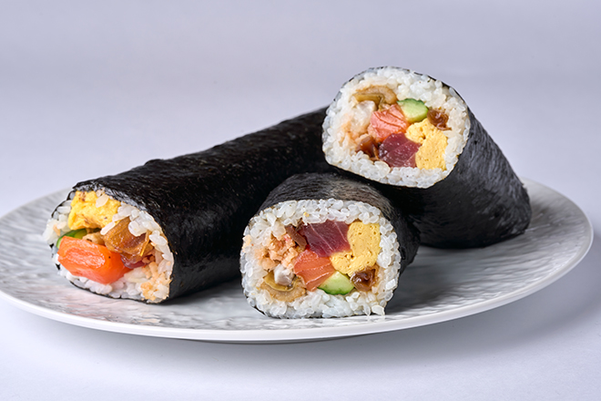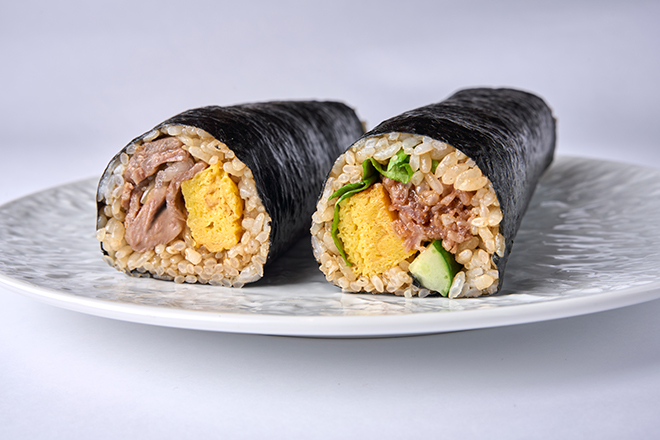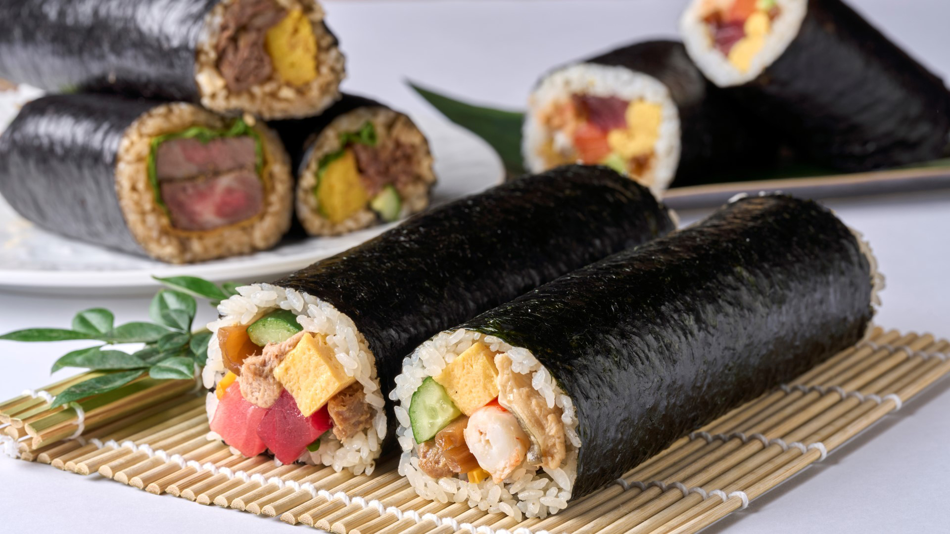 焼肉恵方巻は、黒毛和牛の焼肉に、「日山の焼肉だれ」とコチュジャンを混ぜた、スパイシーでコクのある味付け。すき焼恵方巻は、黒毛和牛のすき焼に、「日山の割り下」「日山のしらたき」を使用しています。