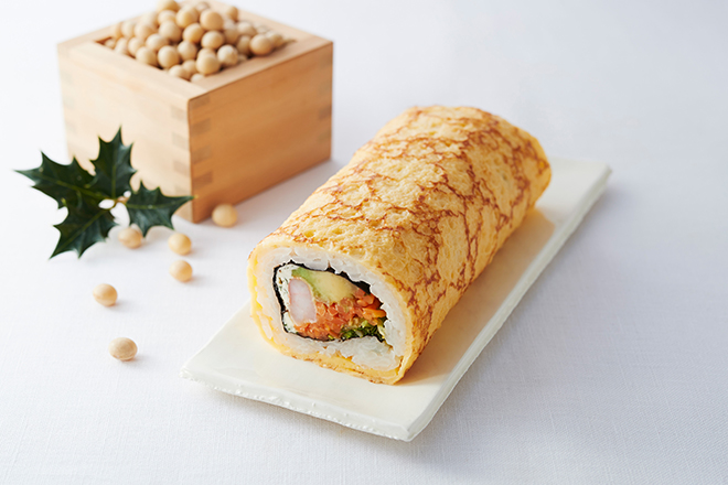 クリームチーズが味のポイント。甘みのある薄焼き玉子で包んだサラダ恵方巻きです。