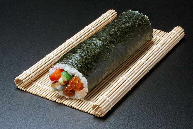 七福神にちなみ、縁起物のかんぴょう、椎茸、穴子、きゅうり、えび(でんぶ)、鯛、人気のだし巻き玉子の7種を、それぞれ店頭で味付け調理をし、マグロとサーモンと共に国産海苔で巻きあげます。1本ずつ心をこめた手作りの恵方巻をお楽しみください。