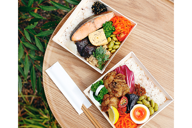 調理師・管理栄養士・フードスタイリストが調味料から無添加にこだわり、丁寧に仕込んだ家庭料理のカフェ&ダイニング「Sta.」の週替わり弁当。メニューは週により肉または魚のどちらか一方を提供。人気の米粉唐揚げや新鮮な魚を使った焼き魚などをメインに副菜がバランスよく詰められています。