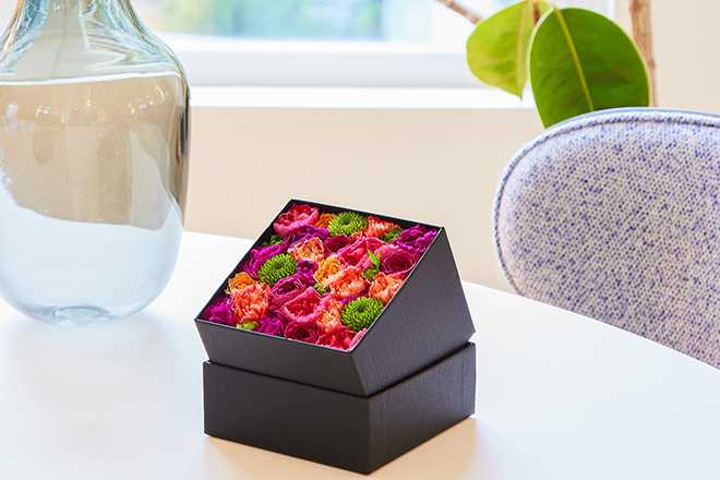 ニコライ バーグマンのフラワーボックスは、ミニマルで洗練されたデザインが特徴で、黒の蓋を開けると新鮮で色鮮やかな花々が驚きと感動をもたらします。花の色彩や形、サイズそれぞれの魅力を引き立てるよう、配置やバランス、細かなディテールまで丁寧に設計されています。贈りやすく、受け取ったそのままの美しさで飾れる点も魅力です。大切な方へ贈るとっておきのギフトやご自宅のインテリアなど、幅広いシーンでお楽しみいただけます。