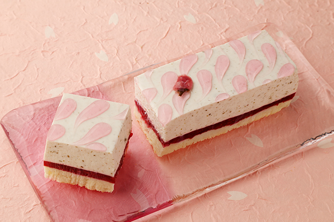 桜と苺をバランス良く合わせたケーキ。桜の花のシロップ漬けと葉の塩漬けを加え、ほのかな塩味に仕上げた桜ムースと、苺の果肉感を残した甘酸っぱいコンポート、しっとりとしたアーモンドスポンジを重ねました。