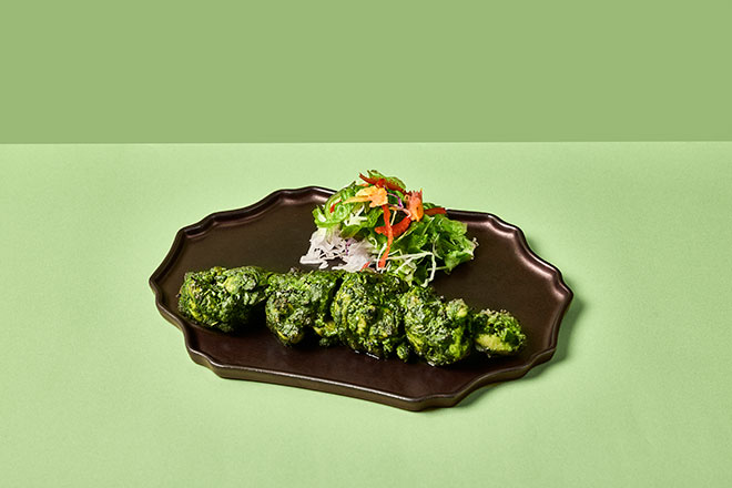 チキンにガーリック、ほうれん草、ミント、スパイスを合わせた特製ソースをたっぷり絡め、仕上げにバターを軽く塗って風味豊かに焼き上げたタンドール料理。スパイスの香りと素材の旨みが引き立つ一品です。辛くないのでどなたでも食べやすく、お酒のお供にも。