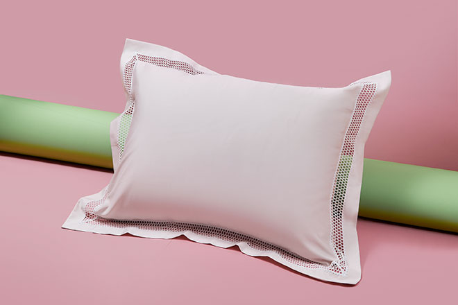 繊細な透かし編みのレースがたおやかな印象をもたらすピローケース。400TCコットンサテンシリーズの同色のリネンと組み合わせることで、いつもの寝室を少しデコラティブに。洗練されたディテールがさりげないエレガンスをもたらし、格調高い空間をつくり出します。