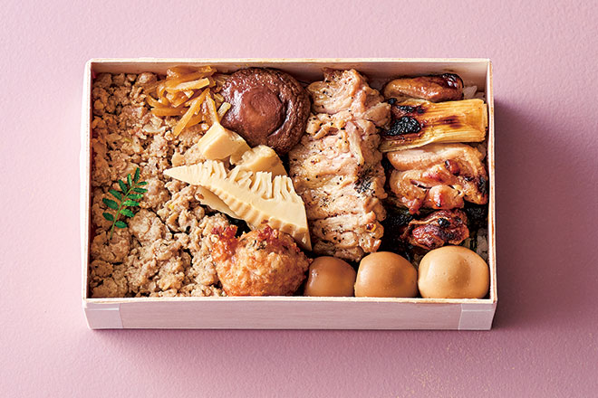 秘伝のたれを使い、備長炭の香ばしさをまとったねぎま、せせり、黒玉(うずらの卵)と、鶏そぼろをぎっしり敷き詰めました。