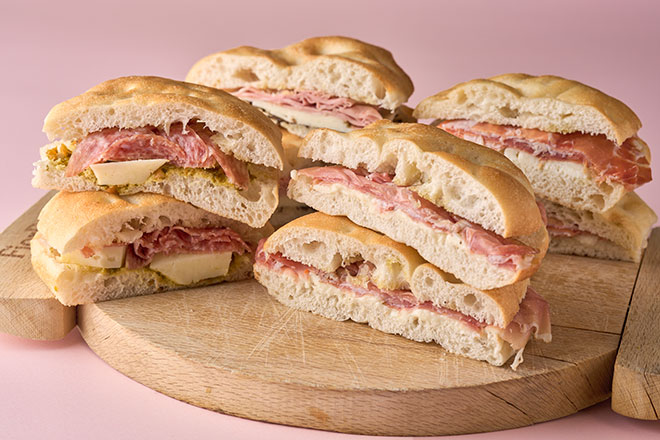 ふわふわフォカッチャにイタリア産チーズと生ハムをサンドしています。