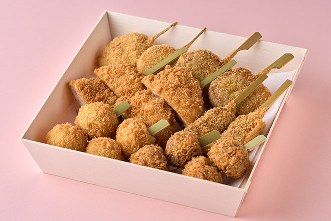 牛肉野菜巻(アスパラ)、豚肉野菜巻(ネギ)、牛串、ヒレカツ串、メンチカツ串、コロッケ串各2本ずつを盛り合わせました。