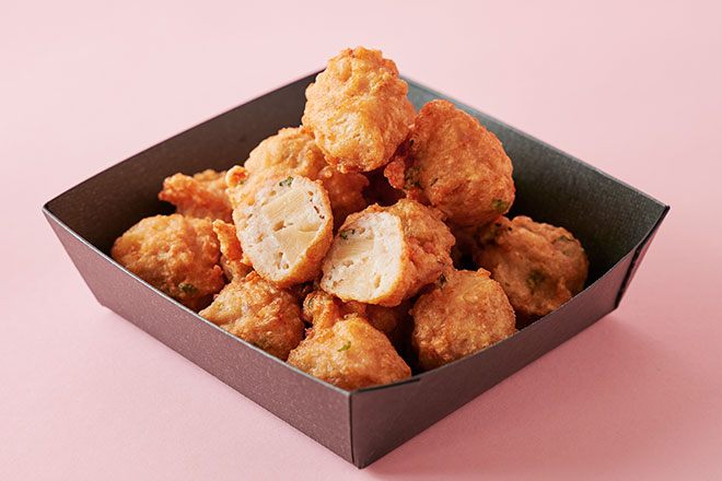 旬のたけのこを鶏肉に練り込み、カラッと揚げたお惣菜。やわらかくてジューシーな鶏肉に、大きめにカットしたたけのこの歯ごたえが楽しい一品です。大葉の香りがさわやかでついつい手が出る、止まらない味わいをぜひご賞味ください。