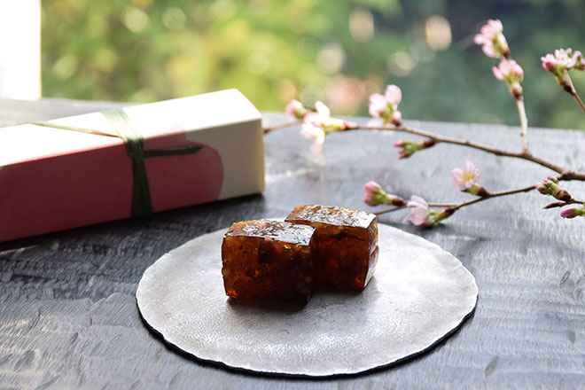 桜の花びらと葉を使った道明寺羹です。 華やかな桜の香りとともに、上品な甘さともっちりとした食感をお愉しみいただけます。