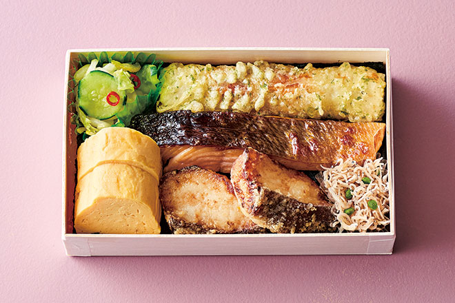 “市場でその日もっとも良い品”を指す「一の線」のみを扱う鮮魚店、渾身の海苔弁当です。北海道産紅鮭の焼き物、銀鱈の西京揚げ、鯛ちくわの磯部揚げ、玉子焼き。こだわりが随所にちりばめられています。